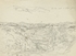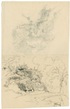 Blick von erhöhtem Standpunkt auf ein Flußtal, gesäumt von Bergen; darüber Bleistiftskizze einer Landschaft, um 1846. Feder in Schwarzbraun, über Bleistift, auf grauem Velin, mit zahlreichen Farbangaben innerhalb der Darstellung. 31,8:46,8 cm. - Leicht fleckig und mit kleinem Einriß am Oberrand. - Verso: Flußlandschaft mit schroffen Felsformationen an den Ufern. Feder in Schwarzbraun, über Bleistift, mit mehreren Farbangaben innerhalb der Darstellung. - Besonders zum rechten Rand hin leicht angeschmutzt. |