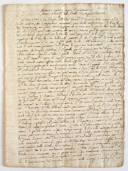 Memoria istorica sopra l'avvenuto in Roma in occasione della Bolla Pretiosus Ben. XIII. [Rom, um 1727.]. Eigenh. Manuskript. 4 SS. 275:203 mm. Lose in Pappmappe. Folio. Vom Verfasser unterdrückt ("dentro le mani") und ausschließlich für die Nachwelt verfasst, bringt dieses anscheinend unveröffentlichte Manuskript eine erbitterte Aufzählung der Reaktionen innerhalb der Kirche auf die umstrittenste Bulle Benedikts XIII., die "Bulla Pretiosus". Benedikt (1724-30), selbst Dominikaner, erlaubte damit den Dominikanern, die Augustinische Gnadendoktrin zu predigen. Besonders interessant ist das Manuskript deswegen, weil es offensichtlich auf Informationen fußt, die v. Kardinal Giambattista Salerni (1670-1729) herrühren, einem Favoriten Benedikts, der den polnischen König August zum Katholizismus bekehrt hatte. Zur Zeit der Abfassung des Manuskripts war der Jesuit Turani (auch Turano), päpstlicher Visitator in Sizilien und Verfasser zahlreicher Abhandlungen (vgl. de Backer/S. VIII, 2709ff. sowie L. Cardella, Memorie storiche de' cardinali VII, 190f.). - Aus der Sammlung Sir Thomas Phillipps (ex Ms. 7532).