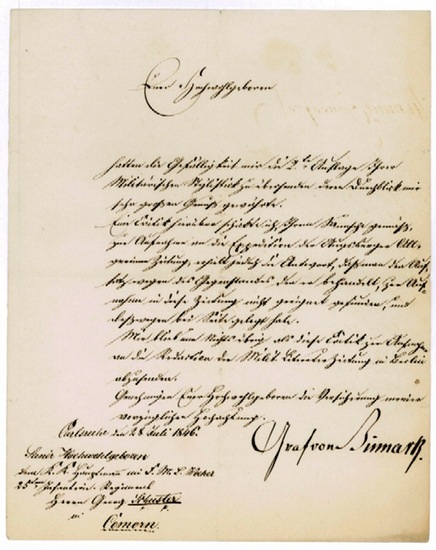 Eigenh. Brief mit U. ("Graf von Bismarck"). Karlsruhe, 28. VII. 1846. 1 S. Gr.-4to. An Hauptmann Georg Schuster in Komorn (Ungarn): "Euer Hochwohlgeboren hatten die Gefälligkeit mir die 2te Auflage Ihrer Militärischen Stylistik zu übersenden deren Durchblick mir sehr großen Genuß gewährte. Eine Critik hierüber schickte ich Ihrem Wunsch gemäß zur Annahme an die Expedition der Augsburger Allgemeinen Zeitung [...]". - F. W. Graf Bismarck stand in hannoverschem und nassauischem Dienst, wurde jedoch aus letzterem wegen eines Verhältnisses entlassen, das er mit der Tochter von Fürst Friedrich August von Nassau-Usingen - die später dennoch seine Frau werden sollte - unterhalten hatte. Er trat dann in englische und seit 1807 in württembergische Militärdienste und zeichnete sich im Krieg von 1809, in dem die Württemberger auf Seiten Napoleons kämpften, unter General Masséna aus; 1812 nahm er an allen Kampfeinsätzen des Korps von General Ney teil. "Seit 1820 war er württembergischer Gesandter in Karlsruhe, 1825-45 in Dresden, Berlin, Hannover und dann wieder in Karlsruhe; 1848 trat er in den Ruhestand" (DBE). Zu Bismarcks zahlreichen Auszeichnungen zählte auch das Kreuz der Ehrenlegion, das ihm 1809 von Napoleon selbst verliehen worden war. - Papierbedingt etwas gebräunt und mit kleinen Randläsuren.