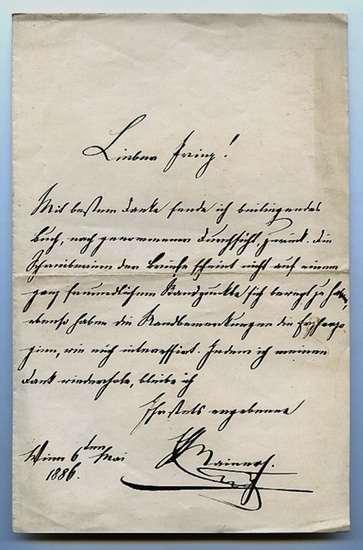 Eigenh. Brief mit U. Wien, 6. V. 1886. 1 S. auf Doppelblatt. Gr.-8vo. An den namentlich nicht genannten Prinz Konstantin zu Hohenlohe-Schillingsfürst (1828-96): "Mit bestem Danke sende ich beiliegendes Buch, nach genommener Durchsicht, zurück. Die Schreiberin der Briefe scheint nicht auf einem ganz freundlichen Standpunkte sich bewegt zu haben, ebenso haben die Randbemerkungen die Erzherzogin wie mich interessiert [...]". - Der Sohn Erzherzog Rainer Josefs von Österreich trat 1843 in den Militärdienst ein, wurde 1852 Inhaber eines Infanterie-Regiments und 1861 Feldmarschalleutnant. Vier Jahre lang war er Präsident des ständigen Reichsrats, später Ministerpräsident und gehörte über vierzig Jahre lang dem Herrenhaus an. Zudem Kommandant der österreichischen Landwehr und Feldzeugmeister, fungierte er auch mehr als 50 Jahre als Kurator der Akademie der Wissenschaften.