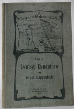 Deutsch-Neuguinea. (= Süsserotts Kolonialbibliothek. Band 1). Berlin: Wilhelm Süsserott. 1901. 3 Bll., 178 S., 12 Bll. 8°. Mit zahlr. Abbildungen, 1 farbig lith. Faltkarte und einigen Abbildungen im Anzeigenanhang. Einband etwas berieben; Rücken etwas stockfleckig; Kapitale etwas bestoßen und mit kleinen Bezugsläsuren; teils etwas stockfleckig; Klammerheftung angerostet.