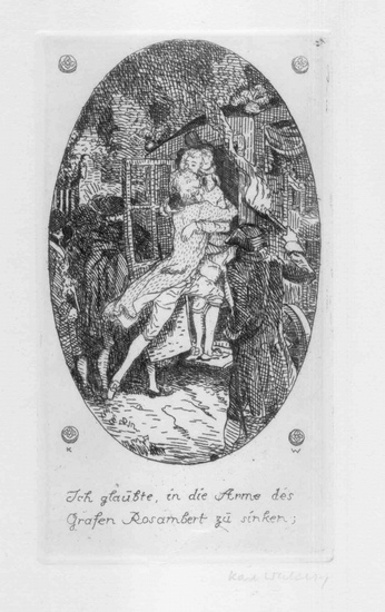 16 Original-Radierungen (inkl. 4 Titelvignetten) aus "Die Abenteuer des Chevalier Faublas" von Jean Baptiste Louvet de Couvray. Plattengrösse: 14,5x8 cm, Titelvignetten: 4,8x6,2 cm. Blattgrösse: 31,8x22 cm. München, Georg Müller, 1910. Komplette Extrasuite des 4bändigen Werkes bei Georg Müller, gedruckt auf Japan, jedes Blatt von Karl Walser in Bleistift signiert.