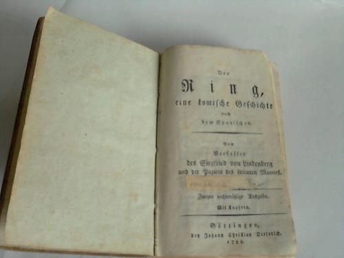Der Ring, eine komische Geschichte nach dem Spanischen Göttingen, 2. Auflage. Johann Christian Dieterich Verlag, 1788. XXXII/252 S. mit 7 Kupfertafeln, Pbd. der Zeit (etwas berieben und bestossen/1 Seite mit kleinem Ausriss/dadurch Textverlust/alter Besitzername auf Titel)---.
