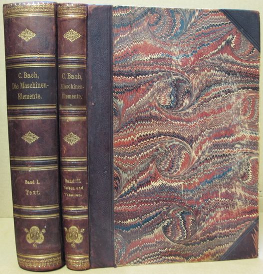 Die Maschinen-Elemente. 2 Bände. Ihre Berechnung und Konstruktion mit Rücksicht auf die neueren Versuche. Leipzig, Alfred Kröner Verlag, 1899. 4°; 1. Band: 736 Seiten, in den Text gedruckten Abbildungen, 3 Texttafeln. 2. Band: 54 Tafeln Zeichnungen und 29 Tabellen;. Einbände berieben, starker Kantenabrieb, Ecken bestoßen. Band 1: vorderer Vorsatz fehlt, Titelblatt lose/ randrissig und gebräunt; Seiten vereinzelt leicht fleckig, papierbedingt leicht gebräunt