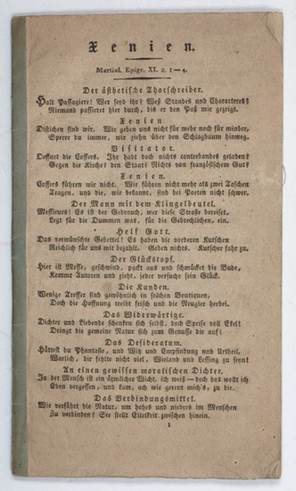 Xenien. Martial. Epigr. XI. 2. 1-4. O. O. u. J. 32 SS. Geheftet. 8vo. Sehr seltener, unautorisierter Nachdruck der Xenien, die der Philosoph Henrik Steffens als Privatdruck in Breslau veranstaltete. Am Schluss mit dem Vermerk: "200 Exemplar als Manuscr. für Freunde". - Mit hs. Notizen in Bleistift. - Goedeke VI, 202. Vgl. E. Boas, Goethe u. Schiller im Xenienkampf (1851), S. 279.