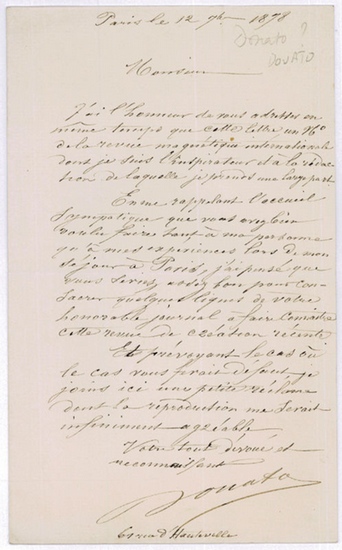 Autograph letter signed ("Donato"). Paris, 12. IX. 1878. 8vo. 1 p. on bifolium. To an unidentified publisher, asking him to promote the new "Revue magnétique internationale" that was published by Donato and Hector Durville. Originally enclosed with the letter was an issue of the magazine and an advertisement: "J'ai l'honneur de vous adresser en même temps que cette lettre un No. de la revue magnétique internationale dont je suis l'inspirateur et à la rédaction de laquelle je prends une large part. En me rappelant l'accueil sympathique que vous avez bien voulu faire tant à ma personne qu'à mes expériences lors de mon séjour à Paris, j'ai pensé que vous seriez assez bon de vouloir consacrer quelques lignes de votre honorable journal à faire connaître cette revue de création récente. Et prévoyant le cas où le cas [!] vous ferait défaut, je joins ici une petite réclame dont la reproduction me serait infiniment agréable". - The bid to popularize the occult journal failed, and the publication was discontinued after less than a year in March 1879. Durville moved on to revive Dupotet de Sennevoy's "Journal du Magnétisme", which would be published until 1934. - Donato was a public and highly successful magnetizer and hypnotist working mainly in Paris. Today he is best known for his public conflict with the pioneering neurologist Jean-Martin Charcot. Although Charcot had discovered hypnosis for his neurological research in the late 1870s, he strongly criticized public hypnotists like Donato. A press feud ensued that lasted at least from 1878 until 1882. - Traces of folds.