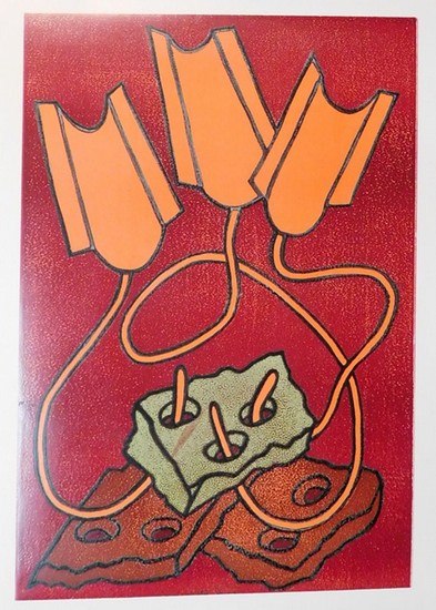 Käsebleche. (HS 180). Bergsdorf, Farbholzdruck bei Saalpresse, 2003. 62x42 cm (Papiergröße: 70x50 cm). Rückseitig handschriftlich signiert, datiert und bezeichnet. Teil einer 12-teiligen Serie mit dem Titel "Orwellskijs".