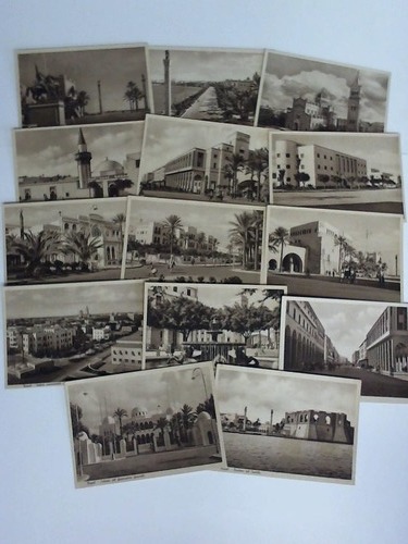 14 Ansichtskarten mit verschiedenen Motiven von Tripoli um, Fichera, Tripoli, 1938. leicht fleckig)---- Enthalten: Monumento al Duce / Lungomare Conte Volpi / Moschea die Via Lazio / Palazzo del Gouerno della Libia / Real Teatro Miramare / Corso Italo Balbo / Veduta panoramica / Fontana die Cavalli Marini / La Cattedrale / Comando Aeronautica / Il Castello / Bastione del Castello / Palazzo del Governatore Generale -.