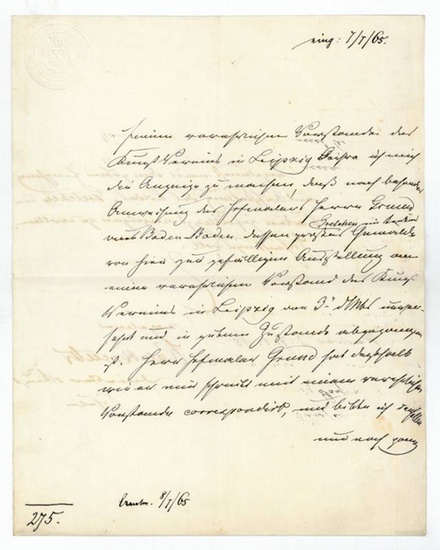 Eigenh. Brief mit U. Weimar, 7. I. 1865. 2 SS. auf Doppelblatt. Gr.-4to. An den Kunstverein in Leipzig mit der Mitteilung, daß auf besondere Anweisung des Hofmalers Johann Grund aus Baden-Baden eines von dessen Gemälden ("Gretchen im Kerker") eben an den Kunstverein "unversehrt und in gutem Zustande abgegangen ist".