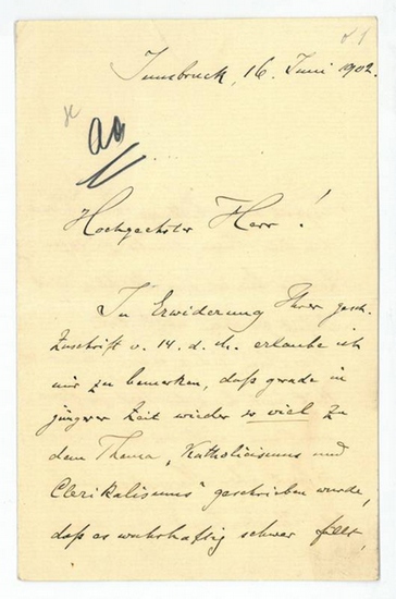 Eigenh. Brief mit U. Innsbruck, 16. I. 1902. ? SS. auf Doppelblatt. 8vo. An einen namentlich nicht genannten Adressaten: "In Erwiderung Ihrer gesch. Zuschrift v. 14. d. M. erlaube ich mir zu bemerken, daß grade in jüngerer Zeit wieder so viel zu dem Thema 'Katholizismus und Clerikalismus' geschrieben wurde, daß es wahrhaftig schwer fällt, irgend etwas halbwegs Beachtenswertes oder Neues darüber zu sagen. Zudem bin ich augenblicklich mit Arbeit geradezu überlastet. Um Ihnen jedoch meine Bereitwilligkeit auch durch die That zu documentieren, will ich das gewünschte Referat über Harnack's Wesen des Christentums [...] übernehmen [...]".