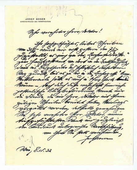 Eigenh. Brief mit U. Wien, 8. IV. 1932. 1 S. 4to. An einen namentlich nicht genannten Herrn Doktor: "Ihr hochgeschätztes, liebes Schreiben vom 31/III. wurde mir erst gestern den 7/IV zugestellt. Es ging von der 'Lerchenfelderstr.' zum Hauptpostamt, von dort an den Ballhausplatz, dann ins Burgtheater und schließlich denselben Weg zurück, bis es zu mir in die 'Lerchengasse' kam. Mittlerweile hätte es auch in New York landen können [...]". Auf Briefpapier mit gedr. Briefkopf. - Josef Moser war in den dreißiger Jahren eines der ältesten Mitglieder des Burgtheaters, an das er 1891 von Max Burckhard geholt worden war. Während der Monarchie mit zahlreichen Orden und Kreuzen ausgezeichnet, war Moser u. a. der Sprechlehrer von Jean Julier, der sich in Verehrung für den Meister fortan "Hans Moser" nannte (vgl. Planer, Jahrb. d. Wr. Ges., 1929, s. v.).