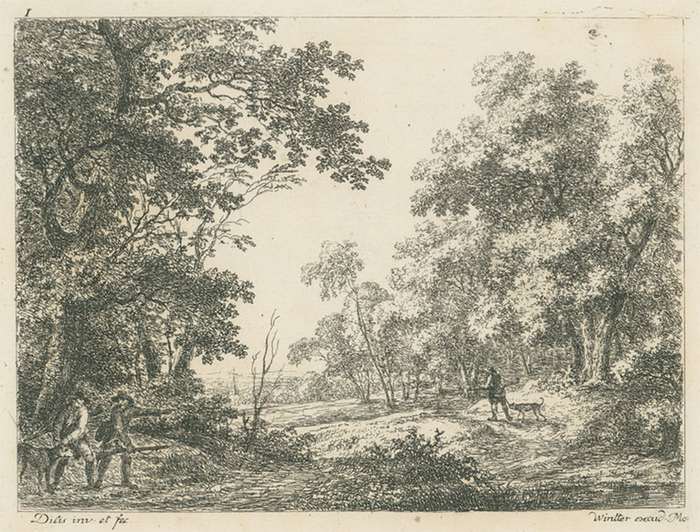 Die Jäger am Ausgang des Waldes, angeblich der erste Versuch des Künstlers. _. Radierung, auf festem Velin. 11,1:15,2 cm. - Mit winzigem Rändchen um die Umfassungslinie sowie zwei kleinen Randbeschädigungen. Literatur: Andresen 3, II (von II). Zunächst studierte Dillis von 1777 - 1781 Philosophie und Theologie in Ingolstadt und München. 1782 wurde er zum Priester geweiht. Anschließend erhielt er Zeichenunterricht bei J.J. Dorner d.Ä. (1741-1813). Seit 1786 erteilte er selbst Zeichenunterricht bei vornehmen Münchner Familien. Durch die Bekanntschaft des Benjamin Thompson Graf von Rumford (1753-1814), der sein Förderer wurde, unternahm Dillis Reisen in die Schweiz und an den Oberrhein. 1790 wurde er Inspektor der kurfürstlichen Bildergalerie in München. Es folgten Reisen nach Salzburg, Sachsen, Dresden, Prag und Wien. 1794/95 weilte er in Rom, 1805 folgte die zweite Italienreise, 1806 war er in Paris und Südfrankreich. 1808 wurde er Professor für Landschaftsmalerei an der Münchener Akademie, 1822 Central-Galeriedirektor. Er wirkte an der Grundsteinlegung der Pinakothek in München 1826 mit und entschied 1834/35 die Auswahl der Bilder für dieses Museum. Mit seinen Freilichtbildern gehört Dillis zu den Begründern der neuen Münchner Landschaftsschule.