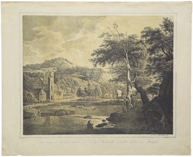 Berglandschaft mit Kloster. J. Ruisdael pinxit. _. Kreidelithographie mit olivgelber und braunocker Tonplatte mit Lichtern im Himmel 1820. 52,3:64,6 cm. Literatur: Aufseesser 262; Dussler 1 und 2; Winkler 654.1.- Das einzige Winkler bekannte Blatt Rauschers aus der Inkunabelzeit.- Blatt11 der ?königl. Sächsischen Gemälde Gallerie zu Dresden?.- Am Oberrand kleinere Einrisse, leicht gebräunt.