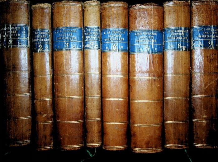 Les oeuvres spirituelles. [in 9 B?nden es fehlt Band 4] Vienne, Chez Jean-Thomas Noble de Trattnern, 1772. 8 Halblederb?nde der Zeit, 8?, XXVIII, [4] Bl., 790 S., 510 S., 239, 460, 669, 455, 519, Titeleien der Teilb?nde nicht mitgebunden, Zustand: gut. Traduites en fran?ois par Mr. Girard [Girard, Guillaume, -1663 [?bers.]].
