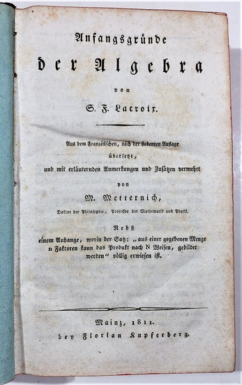 Anfangsgründe der Algebra. Aus dem Französischen, nach der siebenten Auflage übersetzt, und mit erläuternden Anmerkungen und Zusätzen vermehrt von M. Metternich. Nebst einem Anhange, worin der Satz: aus einer gegebenen Menge in Faktoren kann das Produkt nach N Weisen, gebildet werden, völlig erwiesen ist. Mainz, Kupferberg, 1811. 8vo (ca. 20x12 cm), XXII, 596 Seiten, 1 Blatt, Ganzledereinband der Zeit. Hübsche Buchpreisbindung in Ganzleder, vorne und hinten mit reizenden kleinen roten ovalen Ledereinlagen. Rücken und Ecken leichter gestaucht, Exlibris-Eintrag der Zeit auf dem Vorsatzblatt, die Seiten leichter gebräunt, sonst wohlerhalten.