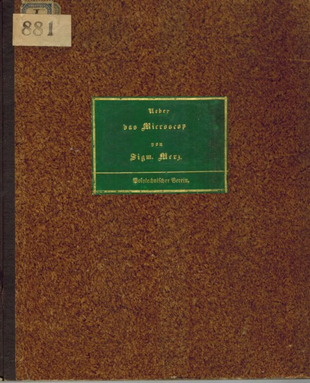 Ueber das Microscop und seine Anwendung in der Technik. Vorgetragen in der monatlichen Vereins-Versammlung [des Polytechnischen Vereins für Bayern] am 5. April 1852. (Besonderer Abdruck aus dem Maihefte des Kunst- und Gewerbeblattes.) Ohne Ort [München], Polytechnischer Verein, 1852. Bibliotheks-Halbleinwand (einer ehemaligen Broschur) mit goldgeprägtem Titelschild; 4°; 20 Spalten; mit Textillustrationen. Signaturschildchen oben links auf dem Vorderdeckel; mit 5 Stempeln des Polytechnischen Vereins versehen; Kanten teils beschabt; insgesamt noch gutes Exemplar.