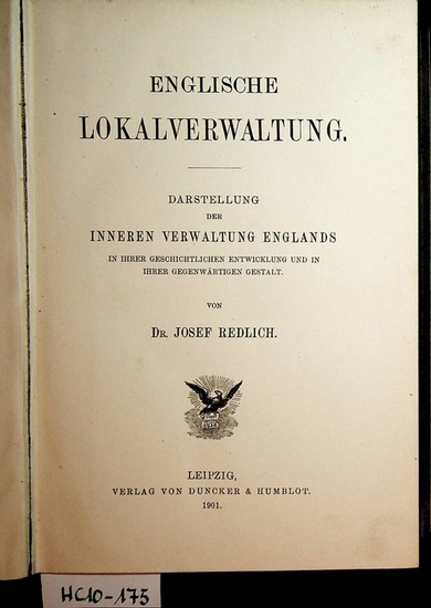 Englische Lokalverwaltung : Darstellung der inneren Verwaltung Englands ; in ihrer geschichtlichen Entwicklung und in ihrer gegenw?rtigen Gestalt Leipzig, Duncker & Humblot Verlag, 1901. original Halbleinenband, gr.-8?, XXII, 835 Seiten; Zustand: gut. Redlich, Josef 1869 bis 1936 vgl. ?BL Bd. 9 S. 10 f. / NDB Bd. 21 S. 246 f.