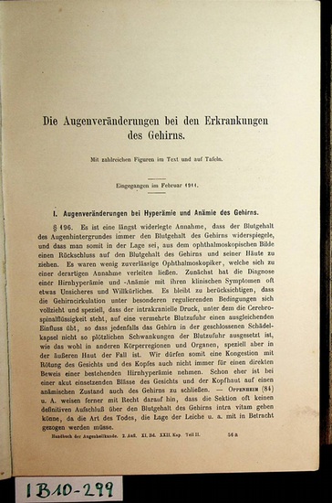 Die Augenver?nderungen bei den Erkrankungen des Gehirns. (=Sonderdruck Aus: Handbuch der gesamten Augenheilkunde : 2. Aufl. ; 11,2) Leipzig [u.a.], Engelmann Verlag, 1913. Leinenband der Zeit, gr.-8?, S. 889-1677; Zustand: gut -.