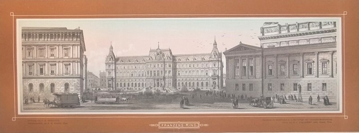 "Franzens-Ring. Vorstadtseite mit dem Justizpalaste.". Farbholzschnitt von F. W. Bader nach L. E. Petrovits. Aus: Die Wiener Ringstrasse in ihrer Vollendung und der Franz Josefs-Quai. Wien, Manz, o. J. (um 1875). Ca. 23 x 63 cm (Blattgröße), ca. 13 x 45 cm (Bildgröße). Schöne Ansicht des Franzens-Ringes in Wien (heute: Burgring Übergang Universitätsring) mit dem Justizpalast und reicher Figurenstaffage. - Nebenhay-W. 492, 16. - Breitrandiges Exemplar. Papierbedingt leicht gebräunt.