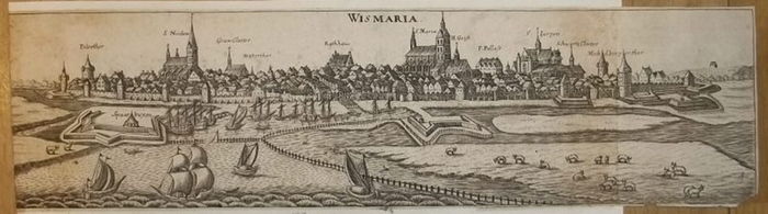 "Wismaria.". Kupferstich. 1650 - 1700. Ca. 10,5 cm x 39 cm. Schöne Gesamtansicht von Wismar von der Meerseite.- Allseitig knapp (am linken Blattrand bis ins Bild) beschnitten und großteils auf altes Papier kaschiert. Gebräunt. Reche untere Blattecke mit kl. Abriss.