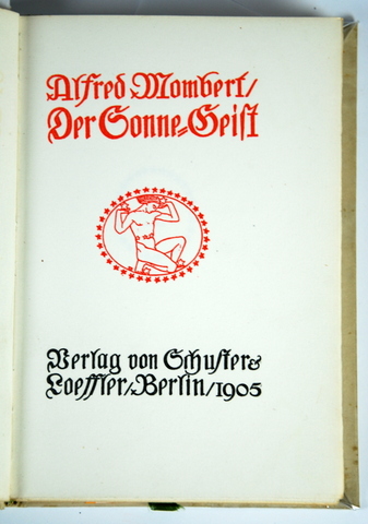 Der Sonne-Geist. Berlin, Schuster & Löffler, 1905. S. 5-71, 1 weißes Blatt. Orig.-Pergamentband mit goldgeprägt. Signet nach E. R. Weiß auf dem Vorderdeckel, Kopfgoldschnitt. 8vo. (20 : 14 cm). * Weber 59. - Erste Ausgabe. - 1 von 20 Exemplaren der Vorzugsausgabe auf Van Gelder-Bütten und in Ganzpergament. Druckanordnung und Buchschmuck von E. R. Weiß. Mit dessen "gezeichneten Signet (knieender Jüngling mit Sternen), das bis 1931 auf sämtlichen Ausgaben Mombertsicher Werke wiederkehren wird" (Weber). - Nicht eingebunden die S. 1-4 mit dem Druckvermerk auf S. 4. Das Werk beginnt hier mit dem Vortitel, dann Haupttitel in Rot und Schwarz. - Der Titel wurde 1918 vom Inselverlag übernommen (siehe Sarkowski 1133). - Vorsätze minimal fleckig, schönes Exemplar.