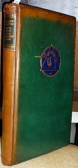 Tagebuch der indischen Reise. Als Manuskript gedruckt. Berlin, Einhorn-Presse (Otto v. Holten), 1912. Folio (34 x 21 cm). Doppeltitel und Buchschmuck von Melchior Lechter. Die ersten 3 u. die letzten 2 S. in Schwarz u. Grün. 1 w. Bl., 105 Bl., 1 w. Bl. Grünes OLdr. (Bock-Saffian) m. goldgepr. Deckelvignette der Einhornpresse u. RSchild., gedruckt auf eigens angefertigtem Altbütten. Innenkantenvergoldung, Goldschnitt. Erste Ausgabe. - Opus II der Einhorn-Presse. - Eines von 333 von Lechter numer. Ex., mit dessen eigenh. Monogramm. Jede Seite mit ornamentaler Textrahmung. - Einband stark berieben, kl. Schadstelle oben am Rücken, an den Rändern u. am Rücken verblichen. Exlibris im Innendeckel. Innen von bester Erhaltung.