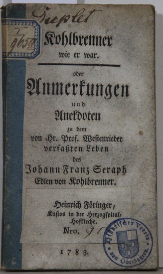 Kohlbrenner, wie er war. Oder Anmerkungen und Anekdoten zu dem von Hr. Prof. Westenrieder verfaßten Leben des Johann Franz Seraph Edlen von Kohlbrenner. Ohne Ort und Verlag, 1783. 111 Seiten. 16 x 9 cm. Orig.-Broschur mit Heftstreifen. *Johann Franz Seraph von Kohlbrenner (1728-1783) stammte aus einfachen Verhältnissen. Da er durch einen Unfall körperbehindert war arbeitete er als Schreibergehilfe in der Salinenverwaltung. Dort fiel er durch Fleiß und Intelligenz auf und wurde später von Maximilan III nach München berufen um eine umfassenden Revision der Registratur der Hofkammer vorzunehmen. 1766 gab er das Intelligenzblatt der Churbaierischen Lande heraus. 1773 wurde Kohlbrenner seiner Verdienste wegen zum Kommerzienrat befördert. Er interessierte sich für zahlreiche Probleme seiner Zeit und war dem Geist der Aufklärung verbunden. Bekannt ist er bis heute vor allem durch sein 1777 zusammen mit dem Komponisten Norbert Hauner herausgegebenen katholischen Gesangbuches. - Rücken mit altem Papieraufkleber, Titelblatt mit altem Stempel und Bibliotheksaufkleber. Seiten teilweise etwas gebräunt. Insgesamt ordentlich erhalten. - Sehr selten.