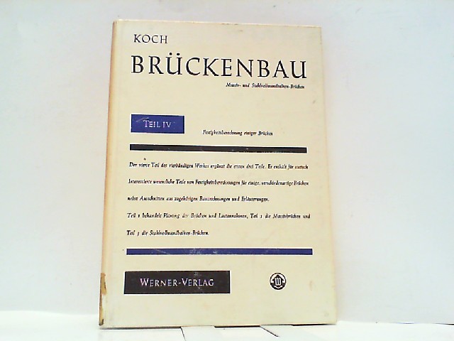 Brückenbau. Massiv- und Stahlvollwand-Balkenbrücken (Balkenförmige Strassenbrücken) Hier Teil 4: Festigkeitsberechnung einiger Brücken. 1. Auflage. Werner Verlag, 1968. 8°, XV, 236 Seiten mit 199 Bildern und 54 Tafeln, betitelter OPbd. - ehemaliges Büchereiexemplar mit Stempel und Einband leicht berieben sonst guter Zustand - 1968. MA473.