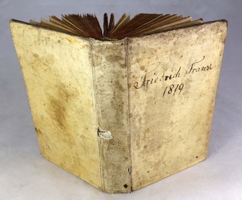 M. Joh. Rhenii Donatus, Denuo Revisus, Multis In Locis, ubi Necessitas Omnino Flagitare Videbatur, Auctus Et Emendatus, Inprimisque Captui Puerorum In Scholis Brunsvicensibus Omni Studio Accommodatus. Editio Omnium Correctissima. BEIGEBUNDEN: [Johannes Rhenius]: Sententiae Sacrae, Ex Evangeliis Dominicalibus & Festalibus aliisque Scripturae partibus, Aetati puerili convenientes. Das ist: Geistliche Sprüche aus den Sonn- und Festtags-Evangelien, auch andern Stükken heiliger Schrift, für die Jugend zusammen gezogen : Denen noch In dieser neuen Ausgabe nicht nur Diejenige Sonn- und Fest-Tage, welche bisher gefehlet haben, sondern auch Kurz-abgefaßte, mit den Evangelischen Texten übereinkommende so wol teutsche, als lateinische Verse, beygefüget sind. 110 Seiten, 1 Blatt. - WEITER BEIGEBUNDEN: Vocabula Rerum Latino-Germanica in Gratiam Studiosae Juventutis Latinitatis Praecipue Elementariorum Literis Exscripta. Wernigerode: Apud Joannem Georgium Struckium, [1790]. 40 Seiten. Titelvignette mit dem Motto "sub umbra alarum tuarum". Brunsvigae (Braunschweig): Apud A.I. Keitelii Heredes. 1747. Klein-Oktav, 17 cm. (Einband am Rücken mit kleinen Fehlstellen, etwas berieben und bestoßen, Schnitt fleckig, Besitzvermerk auf Deckel und Vorsatz, Vorsätze braunfleckig, sonst innen sauber). Auf dem Vorderdeckel und dem fliegenden Vorsatz mit dem Besitzvermerk "Friedrich Franz / 1819". - Das vorliegende "Donat" ist ein oft und an verschiedenen Orten gedrucktes Latein-Lehrbuch. Im Vorwort beklagt der Herausgeber die Unterschiede in den Drucken, die den Unterricht erschweren. - Johannes Rhenius (geb. 1574 in Oschatz; gest. 29. Juni 1639 in Husum) war ein deutscher Lehrer. Er studierte Sprachen an der Universität Leipzig. Er wurde Konrektor an der Thomasschule. Außerdem war er ab 1609 Adjunktus und seit 1617 ordentlicher Professor organi Aristotelici an der Artistenfakultät der Leipziger Universität. Von 1618 bis 1624 war er Rektor des Gymnasiums Eisleben. 1633 war Rhenius Rektor des Stadtgymnasiums Kiel. 1634 ging er als Konrektor an die Lateinschule nach Husum. (vgl. Wikipedia). Das angebundene "Vocabula" scheint sehr selten zu sein. Über KVK konnten wir nur 3 Exemplare weltweit nachweisen: in Halle, Wolfenbüttel und in der University of Illinois. Die Bibliotheken nennen als Autor bzw. Drucker Michael Anton Struck, der allerdings schon 1744 verstorben ist. Der in unserem Exemplar genannte Johann Georg Struck (gestorben 9. April 1789) war also wohl der tatsächliche Drucker und sein Vorgänger Michael Anton der Autor des Wörterbuches. Michael Anton Struck (ca. 1670 - 14. Juni 1744) übernahm 1697 die von Johann Wilhelm Mertens gegründete Buchdruckerei an der Schönen Ecke in Wernigerode. VD18 12948195; VD18 12948209; VD18 10083014. - Weitere Bilder auf Anfrage oder auf unserer Homepage.
