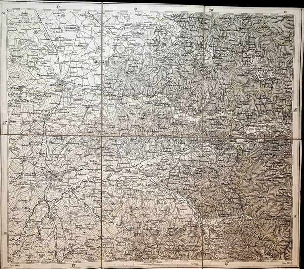 TEMESVAR - [Blatt M.9 der General-Karte von Central Europa 1:300000 1873-1876] Wien, Kaiserlich und K?nigliches Milit?r-Geographisches Institut, 1873. Heliogravure in Kupfer vervielf?ltigt durch Umdruck vom Steine., Blatt ca. 51x 45 cm, Kartenbild; ca. 48 x 42 zu 6 Segmenten auf Leinen aufgezogen; Zustand: sehr gut, teilkoloriert. Generalkarte von Zentraleuropa / Generalcarte von Centraleuropa / 1:300 000 / 1 : 300. 000. Die Generalkarte von Central Europa erschien in den Jahren 1873 bis 1876, sie ist das Werk von Joseph Ritter von Scheda (1815-1888) Nach seiner milit?rischen Ausbildung in Graz, wurde recht bald seine besonderen F?higkeiten f?r das Kartenzeichnen erkannt. Ab 1842 begann seine steile Karriere beim Wiener Milit?rgeographischen Institut. Zun?chst Leiter der Lithographischen Abteilung des Wiener Milit?rgeographischen Instituts sp?ter zeitweise auch der Kupferstichabteilung. War er ab 1869 Chef der Abteilungen Topographie, Lithographie und Kupferstich somit der gesamte Bereich der kartographischen Arbeiten des Instituts. Sein unerm?dliches Bestreben um Verbesserung der technischen und inhaltlichen Qualit?t der Karten trug er wesentlich zur Begr?ndung des Weltrufs des Wiener Milit?rgeographischen Instituts bei. Der hier angebotenen Karte gingen folgende Arbeiten voraus: 1845-47 General-Karte von Europa in 25 Bl?ttern Lithographie, General-Karte des ?sterreich. Kaiserstaates mit einem grossen Theile der angr?nzenden L?nder 20 Blatt in Kupferstich 1: 576 000, in der 2. Auflage 1870-1871 General-Karte von Central-Europa in 47 Bl?ttern, wobei diese Kartenwerke nach eigenen Zeichnungen Schedas im Institut auf seine Kosten produziert wurden. Wegen der hervorragenden Qualit?t wurde konnte die 1 : 576 000 Karte auf dem Ma?stab 1 : 300 000 vergr??ert werden, wodurch mit einem Schlage 207 Bl?tter der Generalkarte vorlagen. Vgl. ADB 53, S. 737 f. / NDB, 22, S. 598 f. / ?BL 10, S. 56 f. / Die Amtliche Kartographie ?sterreichs Wien 1970, S. 28, dieses Kartenwerk blieb bis zu der Generalkarte von Mitteleuropa 1: 200 000 Wien, k. k. milit?rg. Inst 1889-1912 der Standard.