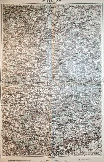Stuttgart - Land: W?rttemberg/Baden/Hessen (= General-Karte von Mittel-Europa 1:200 000. 90. 27? 49?) Wien, Kartogrophisches, fr?her Milit?rgeographisches Institut, 1924. Hochformat, ca. 38 x 55 cm, gefaltet zu 4 Segmenten, Ausgabe: mehrf?rbig; Zustand: gut +. Blatt 90 von 282 vgl. Regele, Oskar: Beitr?ge zur Geschichte der staatlichen Landesaufnahme und Kartographie in ?sterreich bis zum Jahre 1918. Wien, Verlag des Notringes der wissenschaftlichen Verb?nde ?sterreichs, 1955. S. 84.