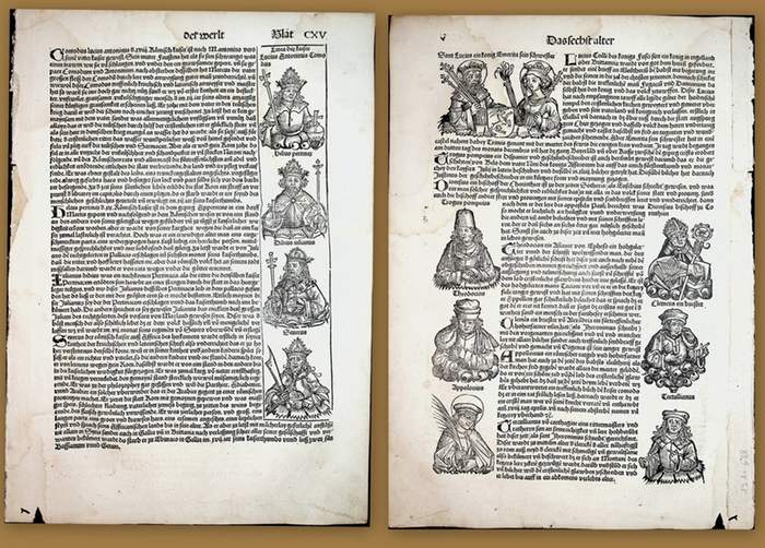 WELTCHRONIK Blatt, Leaf: CXV [115] recto: R?mische Kaiser: Commodus (161- 192); Pertinax (126- 193), Didius Julianus (? 133/137-193), Septimius Severus (146-211) verso: Luzius von Chur, Emerita (Schwester des Luzius von Chur), Pompeius Trogus, Theodotion, Apollonius (Heiliger)(= Apologet) (?-184/185), Clemens von Alexandria(150-ca.215), Dionysios von Korinth, Tertullian (150- 220). N?rnberg, Druck: Anton Koberger, 1493. ganze Buchseite, Einzelblatt, Leaf, Format ca.: 41x29 cm, mit Wasserr?ndern, mit Randl?sur, mit Papierstreifen welcher den Innensteg verst?rkt, mit kl. Wurmgang ausserhalb von Bild und Text. original Holzschnitt, original Woodcut, Deutsche Ausgabe, German edition, Liber chronicarum N?rnbergische Chronik Das Buch der Chroniken, Schedelsche Weltchronik, Michael Wolgemut, Wilhelm Pleydenwurff, Hartmann Schedel, Ikunabelblatt , Icunable leaf.