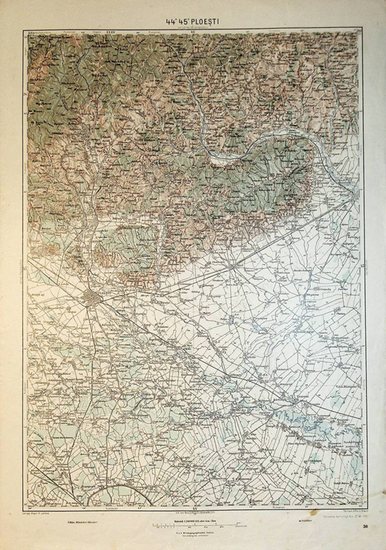 Ploesti - Land: Rum?nien/ Ungarn (= General-Karte von Mittel-Europa 1:200 000. 203. 44? 45?) Wien, Kaiserlich-K?nigliches Milit?r-Geographisches Institut, 1915. Hochformat, ca. 42 x 55 cm, Ausgabe: mehrf?rbig; Zustand: gut , leicht fleckig. Blatt 203 von 282 vgl. Regele, Oskar: Beitr?ge zur Geschichte der staatlichen Landesaufnahme und Kartographie in ?sterreich bis zum Jahre 1918. Wien, Verlag des Notringes der wissenschaftlichen Verb?nde ?sterreichs, 1955. S. 84.