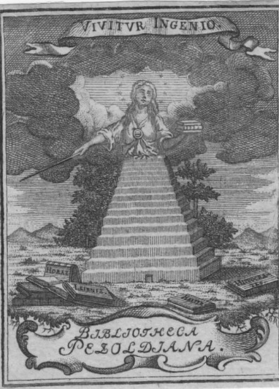 In doppelter Linieneinfassung eine Landschaft mit Bergen und Pyramide, darüber eine vor Wolken schwebende weibliche Figur mit Buch und Stab, oben Band mit Inschrift "Vivitvr Ingenio", unten Bücher über einer Kartusche mit Inschrift "Bibliotheca Pezoldiana". [um 1780]. 72 x 55 mm. Kupferstich, rückseitig kleine Montagereste (b). Warnecke 1556; Blum, Aegypten im Exlibris S. 154 (Beschreibung) und S. 166 (Abbildung). sehr frühe Antiken-Darstellung.