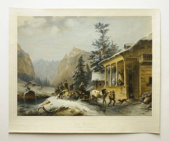 ?Der Winter. Das Jägerhaus im Weichselboden?. Wien, L. T. Neumann (Lith. bei Hanfstaengl in München v. J. Woelfjle), o. J. (um 1870). Altkolor. Lithographie nach Friedrich Gauermann (Blattgröße 47,5 x 57,5 cm, Darstellung 38,5 x 51,5 cm). Vereinzelt min. fleckig (obere Hälfte der Rückseite etw. stärker).