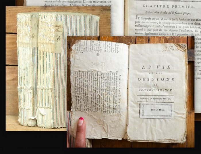 La vie et les opinions de Tristram Shandy. Traduites de l Anglois par Mr. Frenais (1 and 2). Suite et fin de la vie... Traduits... par M.D.L.B (3 and 4). 4 parts in 2 volumes. Neuchatel, Imprimerie de la Société Typographique, 1780 - and London (but Paris), 1785. 8°, circa 18,5 x 11 cm., 2 ff., XII, 390 pp.; XVI, 299, 114 pp., 1 f. (last leaf glued to back cover). Contemporary decorated paper boards with red and blue stripes Cf. Cioranescu 26989. Early French edition, parts 1 and 2 following the translation by Joseph-Pierre Frenais, first published in 1776. Parts 3 and 4 published five years later with an "avertissement des editeurs" explaining that Frenais did not finish his work and the remaining parts of the work had then been translated by the marquis de B(onnay). There is also some discussion about the literary merit and tradition of Sterne s work in this introduction and at the end an appendix gives: Melanges, lettres, pensees, bons mots, & memoires de L. Sterne. - Half-title with old bookplate and small owner s inscription, spines rubbed with some loss of the covering paper, some dog s ears to the first leaves, else fine, uncut, crisp, nice.