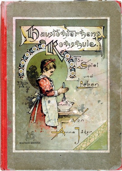 Haustöchterchens Kochschule für Spiel und Leben. Ein Kochbuch mit Wage und Meßgeräten in Puppenmaß. Ravensburg, Maier, o.J. (ca. 1898). 18,5 : 12,5 cm. 4 Blatt, 208 Seiten mit 1 Tafel, 8 illustrierten Zwischentiteln in Rot und zahlreichen Textillustrationen. Original-Halbleinenband mit farbig illustriertem Vorderdeckel. "Alle Probleme mit den Puppen-Maßangaben wurden gelöst - alles war aufeinander abgestimmt. Geschickte Vermarktung ihrer Idee ist der Autorin nicht abzusprechen" (Schroeder 2259). - Vorderer fliegender Vorsatz fehlt, im oberen Rand gering wasserwellig, einige Anstreichungen, Eintragungen und Kritzeleien, mehrer Illustrationen von Kinderhand koloriert. Einband etwas berieben und bestossen. - Klotz 3064/I; Wegehaupt II, 1702; Weiss 1759; vgl. Horn/A. 478 mit Abbildung.