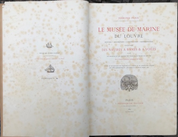 Le Museé de Marine du Louvre: histoire, description, construction, représentation, statistique des naivres à rames & à voiles d'après les modèles er les dessins des galeries du Museé du Louvre (IN FRANZÖSISCHER SPRACHE), Paris, J. Rothschild, 1883. 60 Bl , zahlreiche Illustrationen, VII, 153 Seiten, 42x58, grünes Ohldr auf 5 Bünden mit Rückentitel. Rücken berieben und mit Beschädigung am oberen Kapital, durchgehend etwas stockfleckig, insgesamt aber noch gutes Exemplar. Nr. 164 von 300 Exemplaren.
