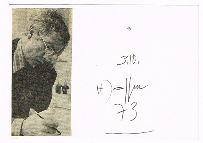 Eigenh. Unterschrift auf Albumblatt mit montiertem Portraitfoto. Hamburg, 3. X. 1973. Quer-8vo. 1 p. Namenszug und Datumsangabe auf Albumblatt neben Portraitfoto.