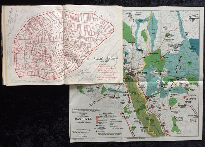 3 Beiträge zur geschichtlichen Entwicklung der Stadt Hannover - Sammelband. Hannover ohne Jahr (wohl 1926-1928). Halbleineneinband der Zeit. Frontispiz mit mont. Abb. vom Schloss Herrenhausen mit großem Garten. Teil 1: Was alte Steine erzählen. Heimatkundliche Beiträge zur Denkmalpflege. 1 Bl., 32 S. (inkl. Nachträge). Mit zahlreichen photographischen Abbildungen. - Teil 2: Ohne Titel, hauptsächlich über Pläne und Ansichten der Stadt Hannover. 28 n.n. S. Mit zahlreichen Abbildungen inkl. einem doppelblattgroßen Plan der Altstadt Hannover um 1780. - Teil 3: Von der Entstehung Hannovers bis zur Gegenwart (1927). 24 S. sowie eine Tafel mit photograph. Abb. und ein großformatiger, farblithographischer "Geschichtlicher Plan des Stadtgebietes Hannover mit den angrenzenden Gemeinden". - In dieser Zusammenstellung vermutlich einziges Exemplar. Einband und Buchblock etwas verzogen. Einband stellenweise etwas lichtrandig. Gut erhalten. Der zweite und dritte Beitrag jeweils mit dem Untertitel "von der Urzeit bis in die Gegenwart unter besonderer Berücksichtigung der Siedlungsverhältnisse".