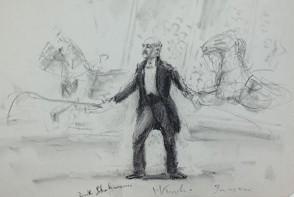 [Der Direktor des Circus Sarrasani. - Kreidezeichnung]. - [Köln, um 1955?]. Zeichnung, Blattmaß: 17 x 24 cm (quer). Die Zeichnung des Kölner Malers Heinz Kroh (1881-1972) ist am unteren Blattrand eigenhändig in Bleistift signiert und unleserlich betitelt. Kontrastreich gezeichnet ist der Direktor des Zirkus Sarrasani in der Manege bei einer Dressuraufführung mit Pferden dargestellt. - Das Blatt ist leicht angerändert und minimal fleckig, sonst gutes Exemplar.
