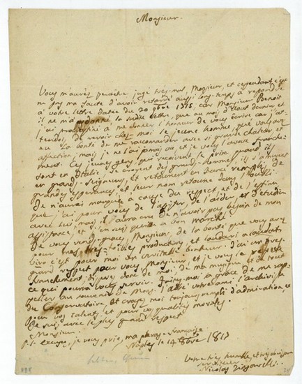 Eigenh. Brief mit U. Neapel, 14. X. 1817. 1 S. auf Doppelblatt. 4to. Mit eh. Adresse (Faltbrief). An den Kirchenmusiker und Komponisten Jean-François Le Sueur (1760-1837) in Paris mit der Empfehlung eines jungen Mannes, den er, Zingarelli, hätte instruieren sollen. Unglücklicherweise sei es jedoch nie zu dieser Ausbildung gekommen. Zingarelli vermutet, der junge Mann habe kein Interesse, und verweist auf ähnliche Fälle solcher Jünglinge, die alle nach Italien kämen, große Lebemänner spielten, dann mit hohen Erwartungen nach Frankreich zurückkehrten, jedoch keinerlei Ruhm fänden, sondern von der Nachwelt vergessen würden: "J'atendois de revoir chez-moi le jeune homme, qui vous avez eu la bonté de me raccomander avec si grande chaleur, et affection; mais je ne l'ai jamais vu, et je vous l'avoue franchement. Ces jeunes gens, qui recoivent la prise quand ils sont en Italie, se croyent des grand-hommes, ils s'amusent en grands-seigneurs, et retournent en France remplis de grandes esperances, et leur nom retourne dans l'oublie [...]". - Mit Ausriss durch Brieföffnung und zwei Randeinrissen.
