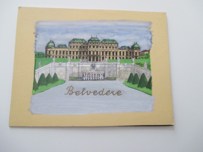 Sammlung von 38 Aquarellen, Zeichnungen und Schrifttafeln. O.O (wohl Wien), 1964 - 1979. 9,5 : 12,5 cm. 38 Aquarelle auf Karton. Sammlung von einem vonmir nicht zu ermittelnden Künstler. Mit einer wunderschönen Ansicht des Schloss Belvedere, Lackenhof, Zum Almsee, 40 Jahre Mauthausen, Wiener Gartenschau 1964, Besuch von Jaun Carlos 1978, Margarethe von dänemark 1979 und vieles mehr.