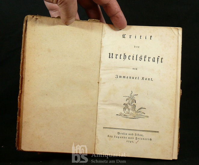 Critik der Urtheilskraft. Berlin und Libau, Lagarde und Friederich 1790. LVIII, 476 S. Pappband der Zeit mit Rückenschild. Insgesamt stärker bestoßen, das Bezugspapier teils auch abgeblättert. Ein Namensstempel am Rücken. Notiz von alter Hd am Vorsatz. Schwache Bleistiftspuren. Erste Ausgabe. Ohne das Blatt mit den Druckfehlern und das letzte (leere) Blatt. Adickes 71. Warda 125. Goed. V.3.16. Volpi 801. Borst 627.