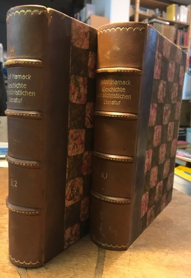 Die Chronologie der altchristlichem Litteratur bis Eusebius. Zwei [2] Bände. Erster Band: Die Chronologie der Litteratur bis Irenäus nebst einleitenden Untersuchungen. Zweiter Band: Die Chronologie von Litteratur bis Irenäus bis Eusebius. Leipzig, Hinrichs 1897, 1904. XVI, 732; XII, 564 Seiten. Halbleder. Schöne goldgepräge, vierbündige Halbledereinbände. Farbiger Schnitt. Berieben und bestoßen, innen gestempelt. Dem Alter entsprechend sehr gut erhalten.