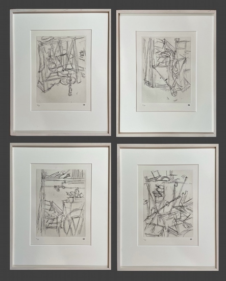 1: Tenailles dans l'atelier de Diego - 2: Coin de l'atelier de Diego I - 3: Coin de l'atelier de Diego II - 4: Cisailles dans l'atelier de Diego. 4 Original-Radierungen. 1965. Plattengrösse: Je 22x16,5 cm. - Papiergrösse: 37x28cm. Unten rechts Stempelmonogramm "AG", links numeriert. Radierungen auf Velin Papier. In hellem Glasrahmen je 40x33 cm. Eines der 90 numerierte Exemplaren. Entstanden als letzte Arbeiten Giacomettis im Atelier von Diego. Alberto Giacometti wurde nach Beendigung der Arbeit an den Platten ins Spital eingeliefert. Er konnte deshalb selbst die Abzüge der Radierungen nicht durchführen. Später hat die Fondation Giacometti in Paris 90 Abzüge aus den Originalplatten verfügt, numeriert und mit dem Stempelmonogramm versehen. Literatur: Kornfeld 443 C - 446 C. (4).
