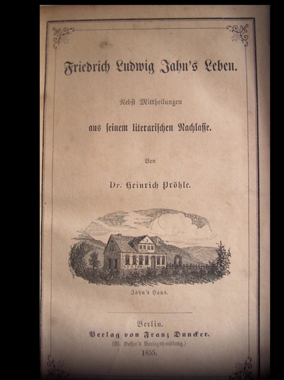 Friedrich Ludwig Jahn's Leben. Nebst Mittheil. aus seinem literar. Nachlasse. Berlin, Duncker, 1855. M. 1 Faks. XVI, 425 S. Spät. Hlwdbd. m. mont. ORücken. M. Rsign. OU. eingeb. St. verso Tit. Durchg. stockfl. Erste Ausgabe.- Erste Biographie über den 1852 verstorbenen "Turnvater" Jahn, unter Benutzung von Briefen Jahns und Zeugnissen von Zeitgenossen. Im Anhang ab S. 295 mit einigen Erstdrucken aus dem Nachlaß.