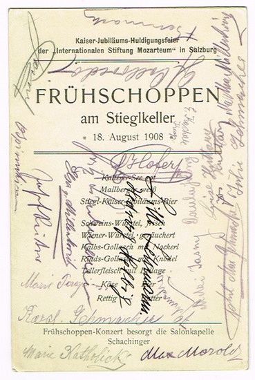 Bildpostkarte mit zahlreichen eigenh. Unterschriften. Salzburg; Stieglkeller, 18. VIII. 1908. 8vo. Hübsche, farbige Bildpostkarte mit Außenansicht des Stieglkellers in Salzburg. Rückseitig mit Einladung zum ,Frühschoppen am Stieglkeller *18. August 1908? anlässlich der ,Kaiser-Jubiläums-Huldigungsfeier der ?Internationalen Stiftung Mozarteum? in Salzburg'.Unterschriften mehrerer österreichischer Persönlichkeiten, u.a.:Josef Reiter, Komponist und Direktor des Salzburger Mozarteums (1908-1911); Max von Millenkovich, Unterschrift mit pseud. Max Morold, Direktor des k. k. Hofburgtheaters (1917-1918); Lilli Lehmann (dt. Opernsängerin *1848-1929); Hedwig Helbig (dt. Sopransängerin *1869-1951, Nichte v. Lilli Lehmann); Julie Gehmacher (*1875-1964);phil. Max Gehmacher (*1858-1938); Josef Huttary (*1871-1967); Luise Huttary (*1879-1950).