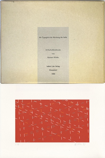 die Üppigkeit die Werbung die Stille. 12 Farboffsetdrucke von Karsten Wittke. Düsseldorf, halber Liter Verlag, 1992. Quer-4°. 26,5 x 33 cm. 14 lose Blätter in Original-Kartonbox. 12 Original-Farboffsetdrucke mit Motiven von Karsten Witte, unterhalb der Abbildung jeweils signiert, mit [19]"92" datiert und mit "6/40" nummeriert. Blattgröße: 29,7 x 21 cm, Abbildungsgröße: ca. 12 x 20,8 cm. Gedruckt von Jan van der Most, Düsseldorf, auf 300g/qm Offsetpapier. Sehr gutes Exemplar.