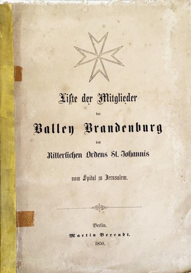 Liste der Mitglieder der Balley Brandenburg des Ritterlichen Ordens St. Johannis vom Spital zu Jerusalem. Berlin, Berendt, 1859. 2 Bll., 185 Seiten. Original Karton (etwas fleckig, Oberkante berieben, Rücken alt überklebt). Seltenes erstes Mitgliederverzeichnis der Balley Brandenburg nach der Wiederrerichtung 1852 (Auflösung im Jahre 1810) durch König Friedreich Wilhelm IV. von Preußen. Der König wollte seinem Adel einen diakonischen Auftrag verleihen und nahm damit Bezug auf die Ursprünge des Ordens. 1853 konnte so offiziell ein neuer Herrenmeister, Prinz Carl, der Bruder des Königs, gewählt werden. Die Wiedererrichtung stellte eine gelungene Symbiose aus Kontinuität und Tradition bei gleichzeitiger Ausrichtung und Strukturierung auf moderne Aufgaben dar. Zahlreiche Träger des Verdienstordens, wie auch Fürst Pückler, wurden als Ehrenritter in den wiederbegründeten Orden aufgenommen. PA3-81.